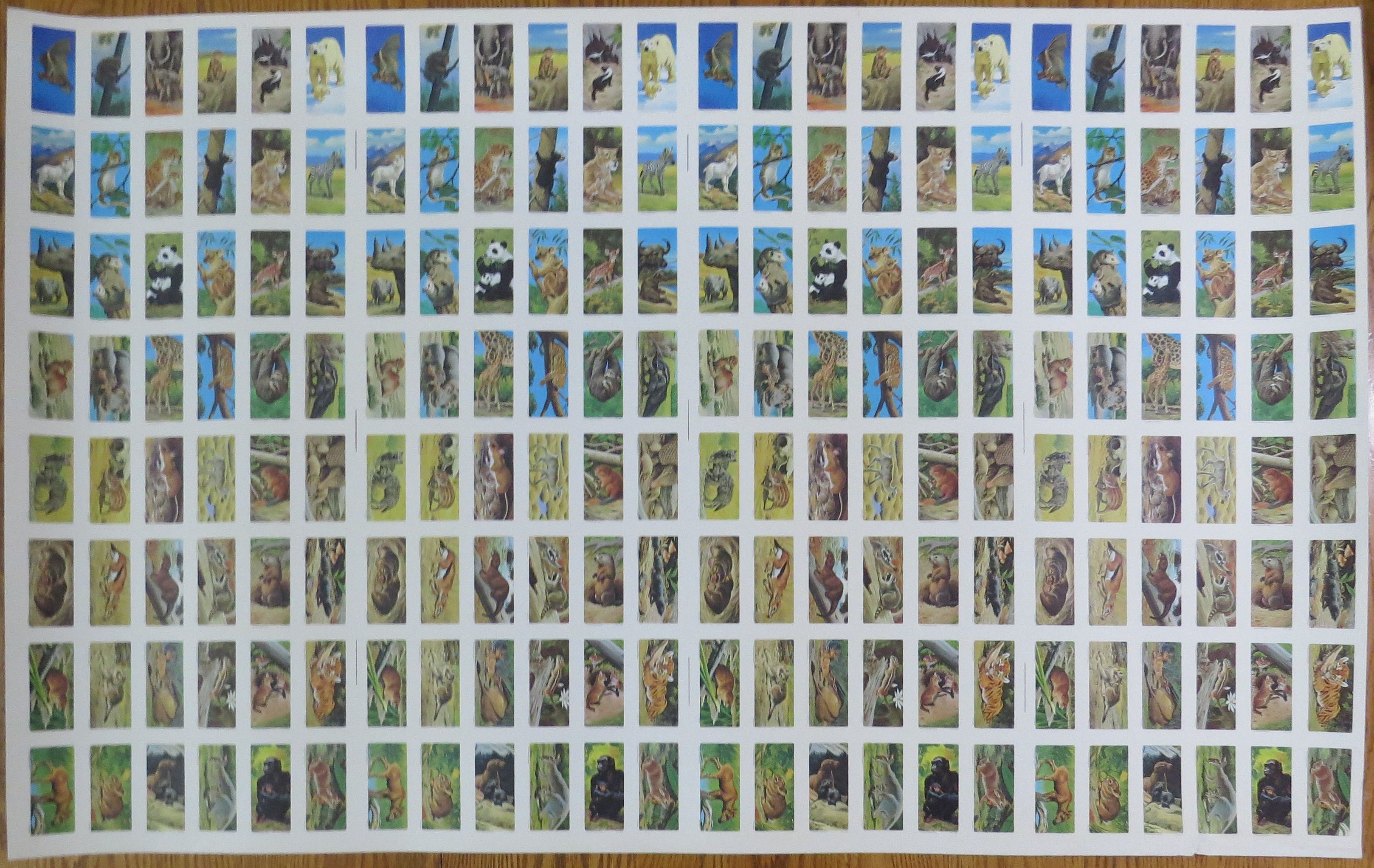 This is the Press Sheet version of the 1990 remake by Lipton Red Rose titled "Animals and Their Young." We are talking about 4 sets of cards in a format of twenty-four by eight, the sets repeat but not in numeric order. On the front side you can see three sets of marks that delineate the four sets. At least for me, the whole idea of a four set press sheet is new. All the sheets I have ever seen up to now is a single set to a sheet. I guess the old dog is learning new tricks.