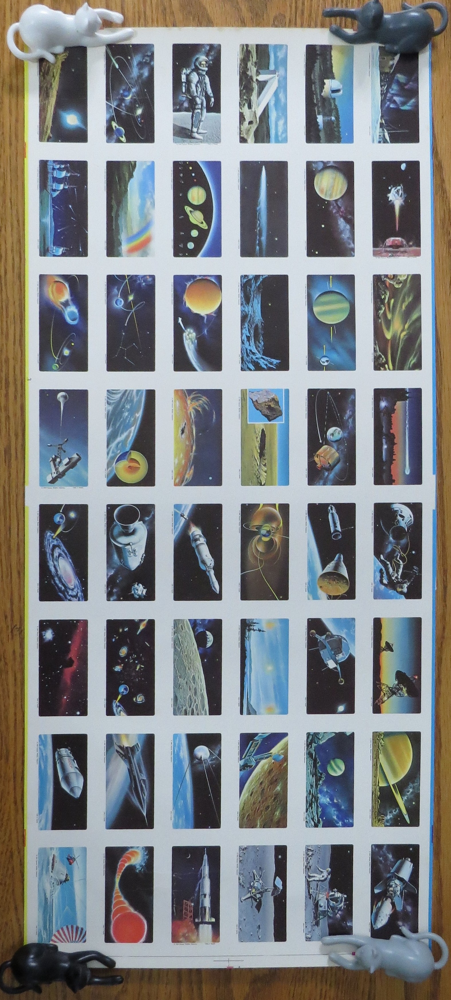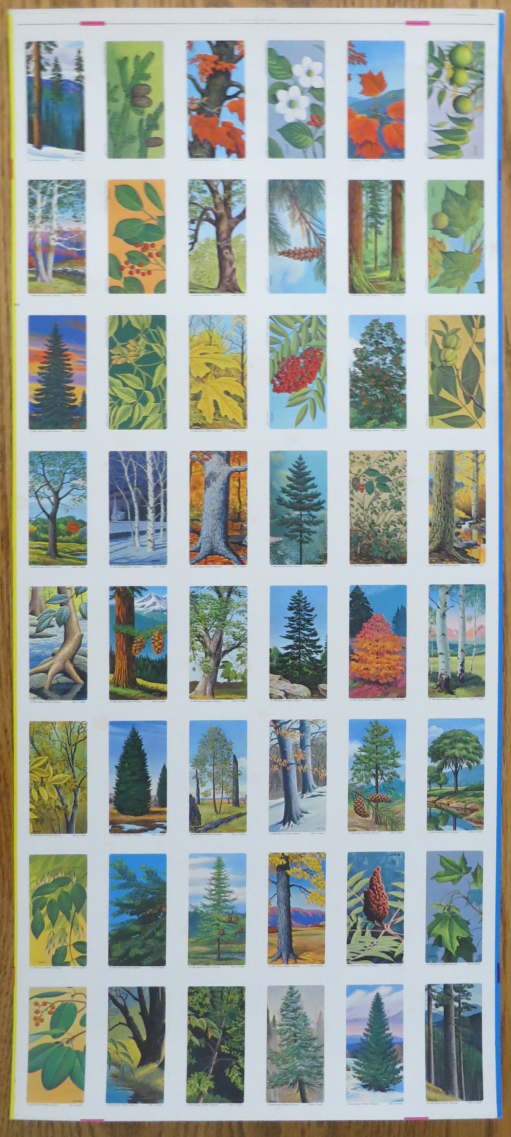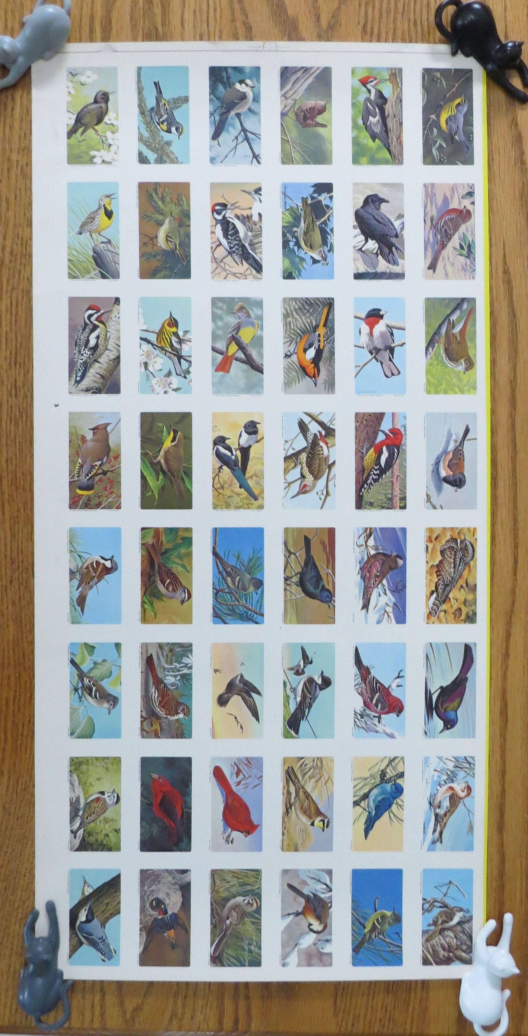 This page is here to discuss a special thing to collect in the tea card world. We are talking about a whole set of cards uncut... you know, a printer's sheet. These are assumed to come from the printer because Red Rose only received the cards cut individually in sleeves from the printer. Every sheet I have ever seen has shown the 48 cards with six across and eight down... unless you hold it the other way and it looks like eight by six ;-). I've also noticed that the order of the cards appears to be random. They do not go in card number order. The uncut sheets can be collected in one of two ways. Either the front and back are both printed or just the front (picture side) is printed. I suppose it's possible for just the back to be printed but I have never seen that and doubt it would have any value. So are we anxious to see what one or two look like? This is the 1990 remake by Lipton Red Rose of the old Brooke Bond Series 15 titled "Animals and Their Young." As I said, six by eight, a whole set... but not in numeric order. Looking at the two sides, you can clearly see how it matters that both sides be lined up on both the vertical and horizontal axis. Otherwise you have one of those printer errors I talk about elsewhere. This is a pretty nice "Dinosaurs and Other Prehistoric Animals" Series 5 sheet I saw on eBay way back when. I never bothered to get a pic of the back so I assume it was probably blank. As before, this sheet is six by eight and not in numerical order. If you look close you notice that all of the artworks are there but no "© 1963 National Wildlife Federation" or "Litho in Canada" that appear below the images. It makes one think that it must have been a last step after applying the colors. This is a slightly curly "Canadian / American Songbirds" Series 9 sheet with help to flatten from some kitties. This one was only printed on the front side so the back looks a bit blank. As before, this sheet is six by eight and not in numerical order. It should be clear why thinking no one would collect a sheet with just the back printed on it... at least to me that makes sense. This is a "Trees of North America" Series 11 sheet. This one was printed on both sides but if you frame the set, you never see the back. As before, this sheet is six by eight and still not in numerical order. In this sheet, you can see the forest for the trees... whatever that means. This is a slightly curly "The Space Age" Series 12 sheet with those kitties to flatten it out for us. This one was only printed on the front side so the back looks a bit blank. As with all the rest, this sheet is six by eight and still not in numerical order. It's fun to try and get as many sheets as you can. These sheets are great collector's items.