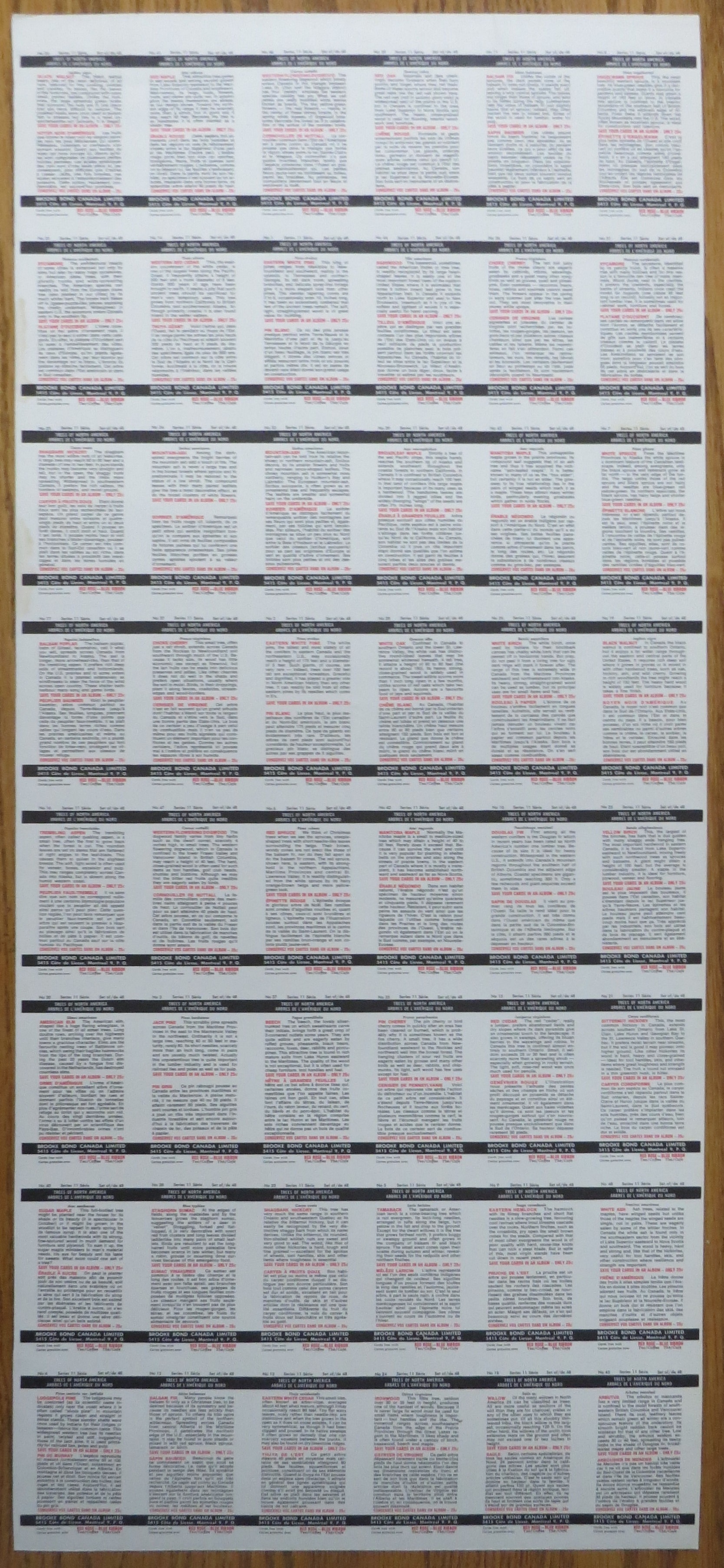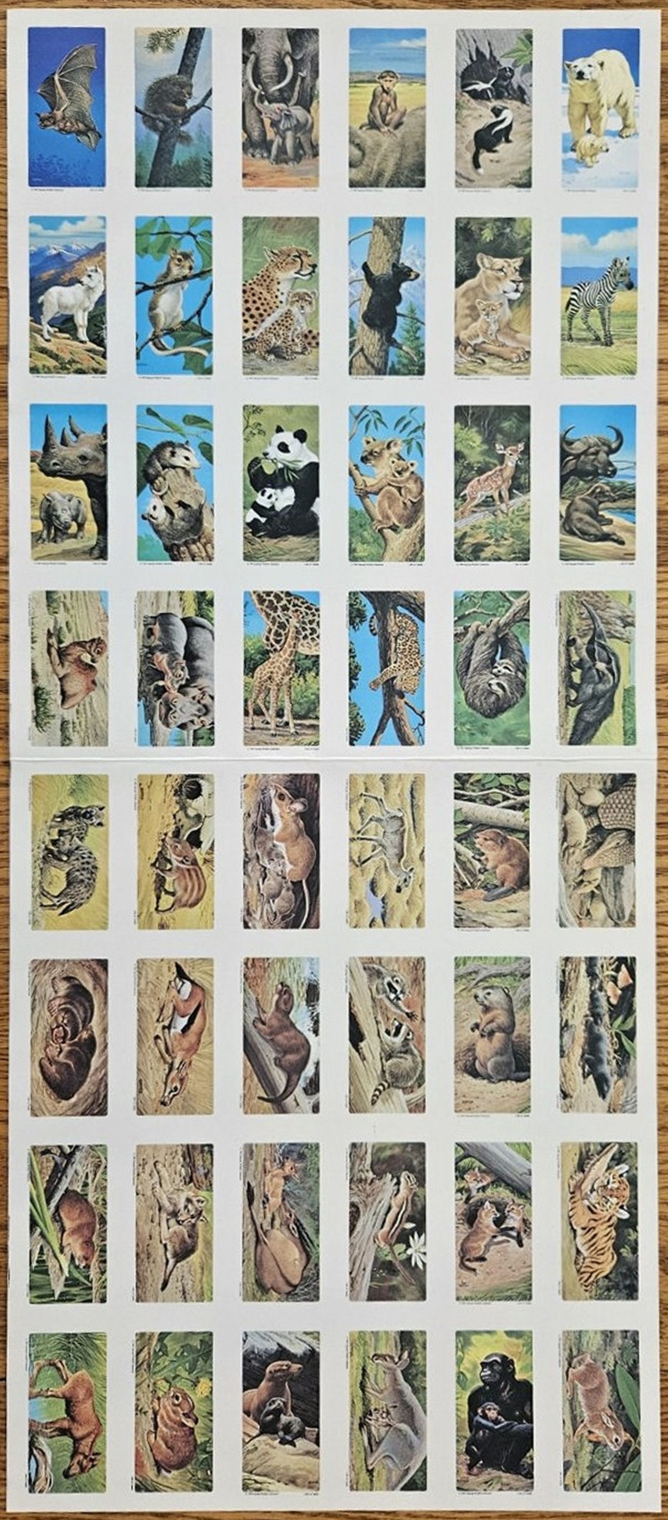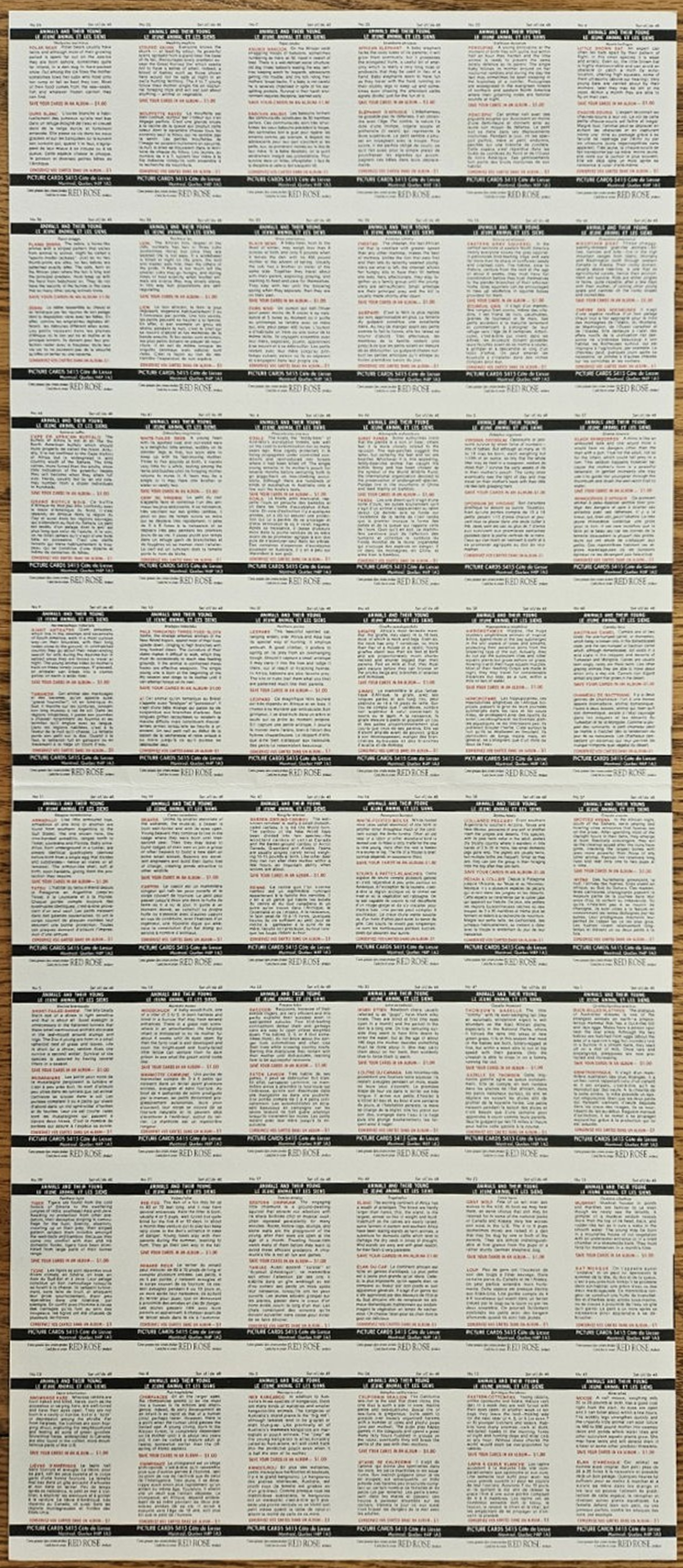 This is the Press Sheet version of the 1990 remake by Lipton Red Rose titled "Animals and Their Young." We are talking about 4 sets of cards in a format of twenty-four by eight, the sets repeat but not in numeric order. On the front side you can see three sets of marks that delineate the four sets. At least for me, the whole idea of a four set press sheet is new. All the sheets I have ever seen up to now is a single set to a sheet. I guess the old dog is learning new tricks.