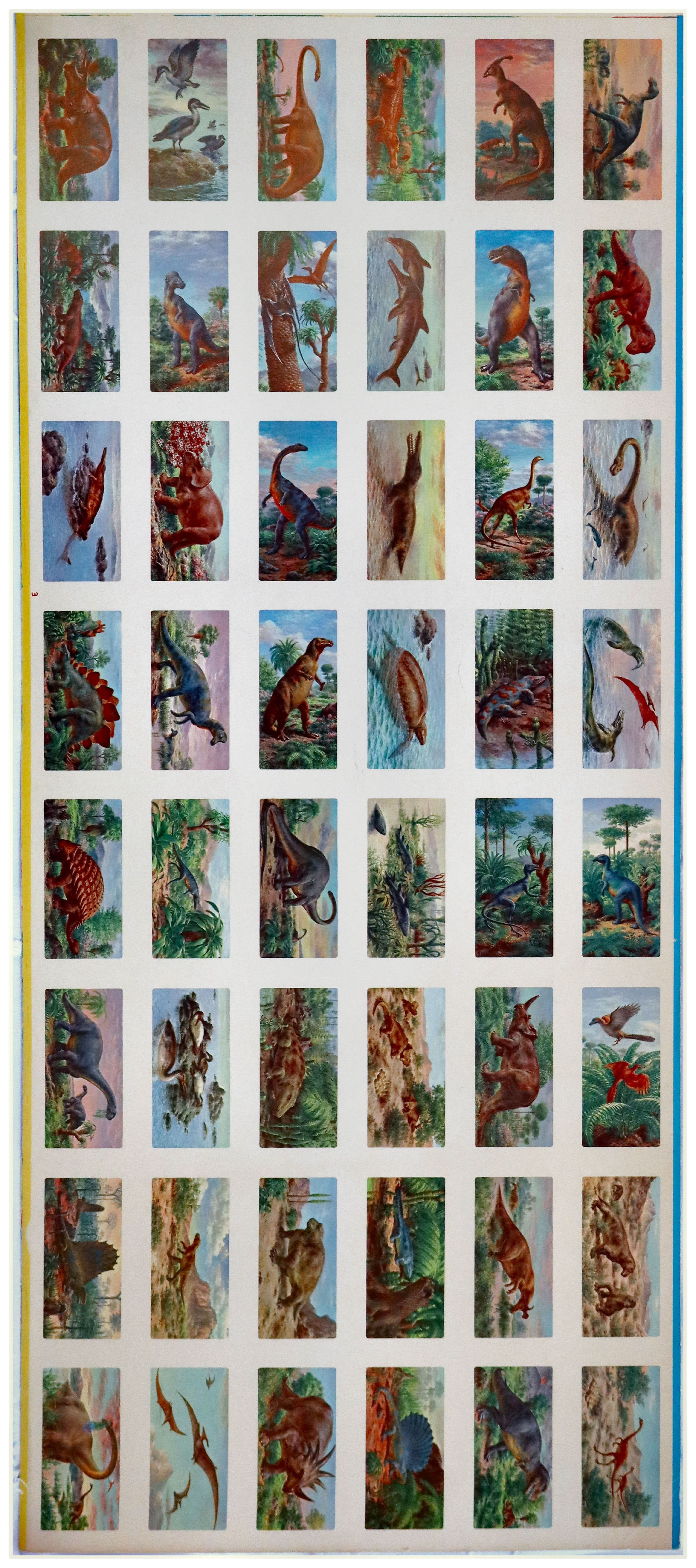 This page is here to discuss a special thing to collect in the tea card world. We are talking about a whole set of cards uncut... you know, a printer's sheet. These are assumed to come from the printer because Red Rose only received the cards cut individually in sleeves from the printer. Every sheet I have ever seen has shown the 48 cards with six across and eight down... unless you hold it the other way and it looks like eight by six ;-). I've also noticed that the order of the cards appears to be random. They do not go in card number order. The uncut sheets can be collected in one of two ways. Either the front and back are both printed or just the front (picture side) is printed. I suppose it's possible for just the back to be printed but I have never seen that and doubt it would have any value. So are we anxious to see what one or two look like? This is the 1990 remake by Lipton Red Rose of the old Brooke Bond Series 15 titled "Animals and Their Young." As I said, six by eight, a whole set... but not in numeric order. Looking at the two sides, you can clearly see how it matters that both sides be lined up on both the vertical and horizontal axis. Otherwise you have one of those printer errors I talk about elsewhere. This is a pretty nice "Dinosaurs and Other Prehistoric Animals" Series 5 sheet I saw on eBay way back when. I never bothered to get a pic of the back so I assume it was probably blank. As before, this sheet is six by eight and not in numerical order. If you look close you notice that all of the artworks are there but no "© 1963 National Wildlife Federation" or "Litho in Canada" that appear below the images. It makes one think that it must have been a last step after applying the colors. This is a slightly curly "Canadian / American Songbirds" Series 9 sheet with help to flatten from some kitties. This one was only printed on the front side so the back looks a bit blank. As before, this sheet is six by eight and not in numerical order. It should be clear why thinking no one would collect a sheet with just the back printed on it... at least to me that makes sense. This is a "Trees of North America" Series 11 sheet. This one was printed on both sides but if you frame the set, you never see the back. As before, this sheet is six by eight and still not in numerical order. In this sheet, you can see the forest for the trees... whatever that means. This is a slightly curly "The Space Age" Series 12 sheet with those kitties to flatten it out for us. This one was only printed on the front side so the back looks a bit blank. As with all the rest, this sheet is six by eight and still not in numerical order. It's fun to try and get as many sheets as you can. These sheets are great collector's items.
